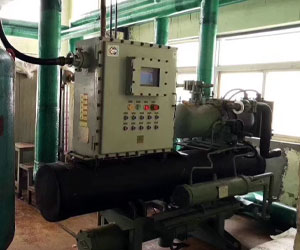 該項目的化工低溫制冷系統(tǒng)有防爆要求,綜合考慮后選用防爆型螺桿式低溫冷水機組,防爆等級為d I I B T 4 級, 防護等級為I P 5 5 ,高壓啟動柜獨立設(shè)置,操作安全性提高。